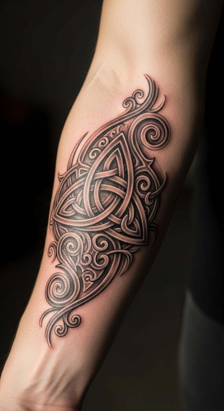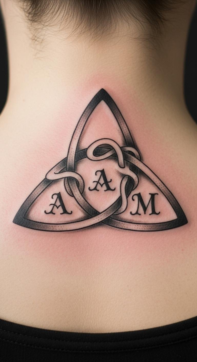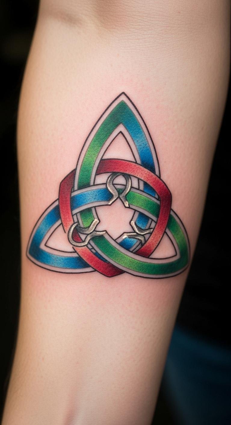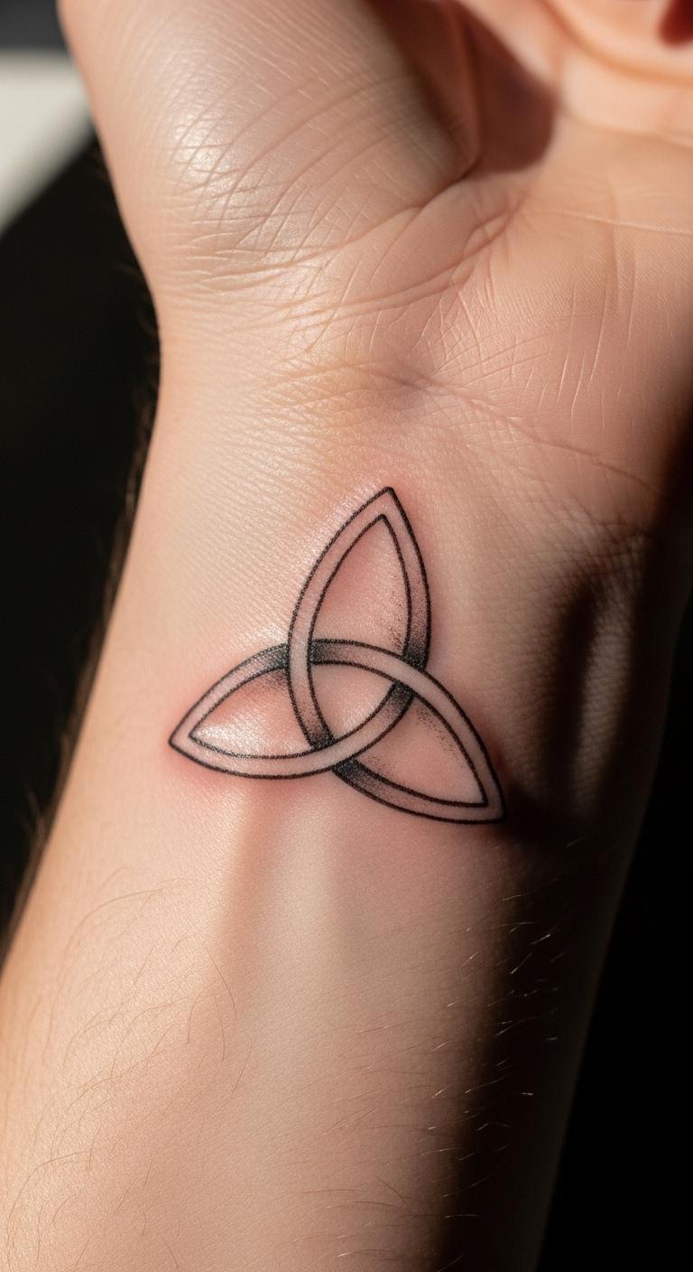 This version nods to faith, representing Father, Son, and Holy Spirit through the loops. It’s perfect for a meaningful arm piece. Choose spots like your back for discretion. Grab free religious art online to adapt at home with basic drawing tools. Costs stay budget-friendly if you opt for smaller sizes. Look for artists in community centers who offer deals. Bold this: add your faith. Practice with household items like markers to visualize it. The design brings spiritual strength without overwhelming details.