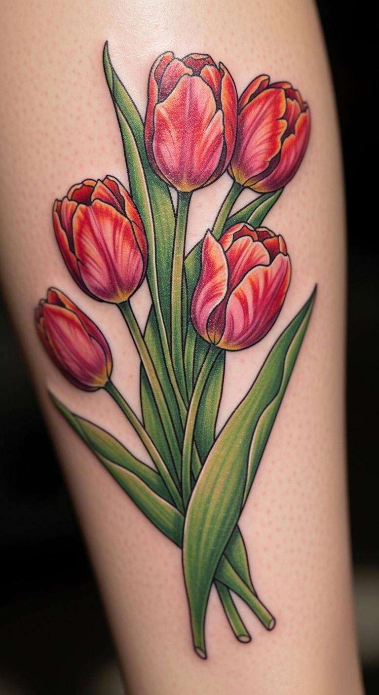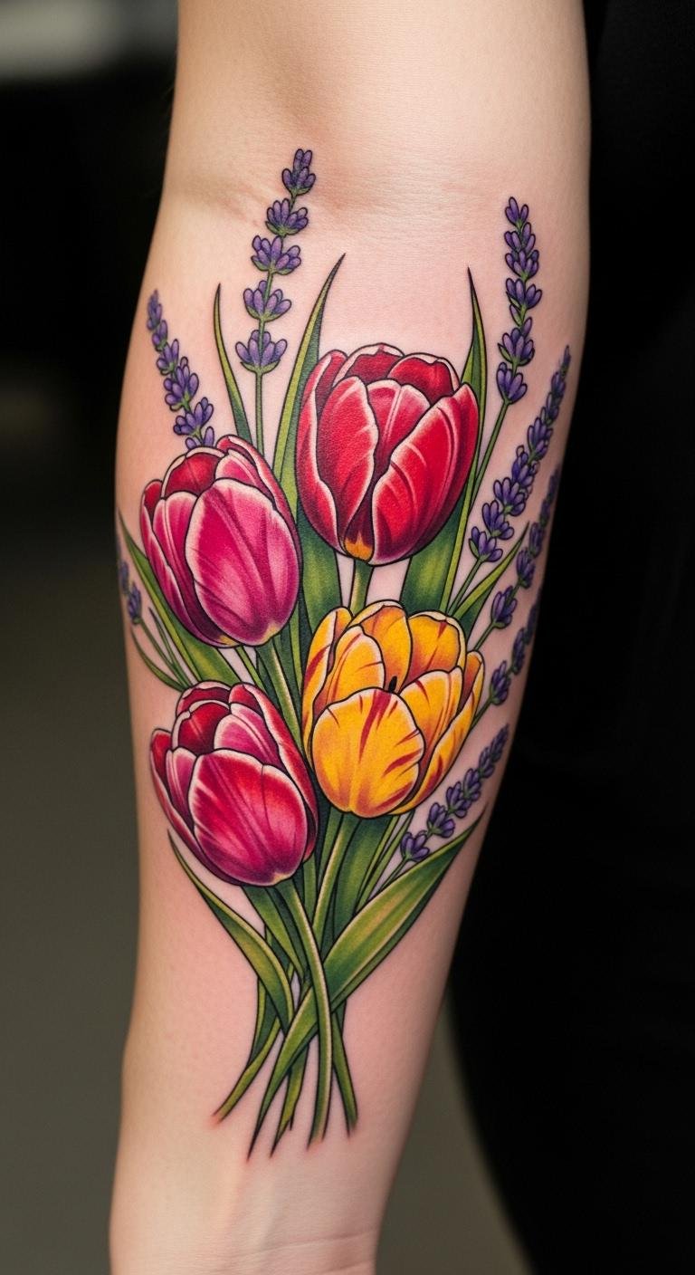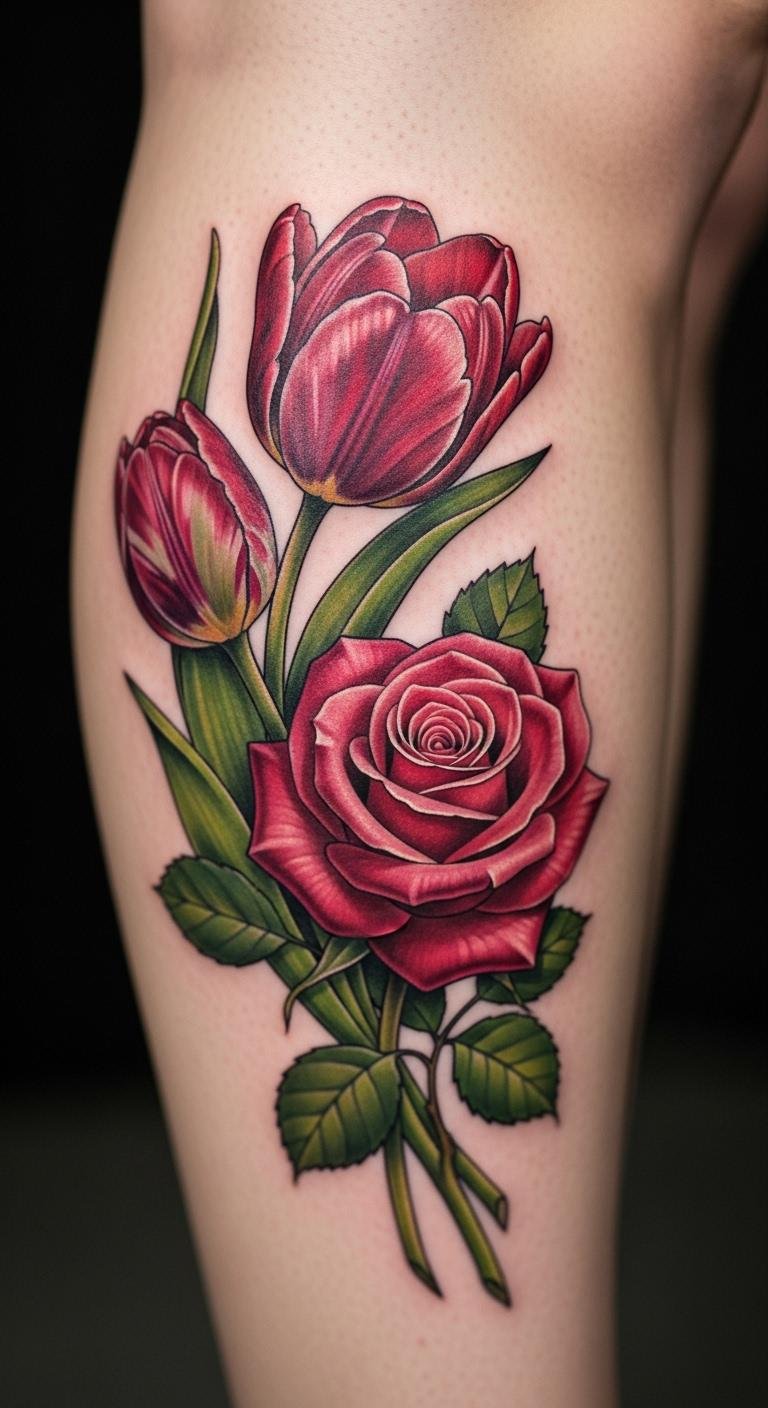 Mix flowers for more depth. Pair tulip with roses. It tells a story of growth. Sketch combinations on paper. Use free apps for designs. Opt for ankle spots. Artists charge around $120 for extras. Watch videos for inspiration. Add lavender for calm feels. Clean the tattoo spot daily. This creates a personal scene. Try drawing at home first. Results feel rewarding and unique.