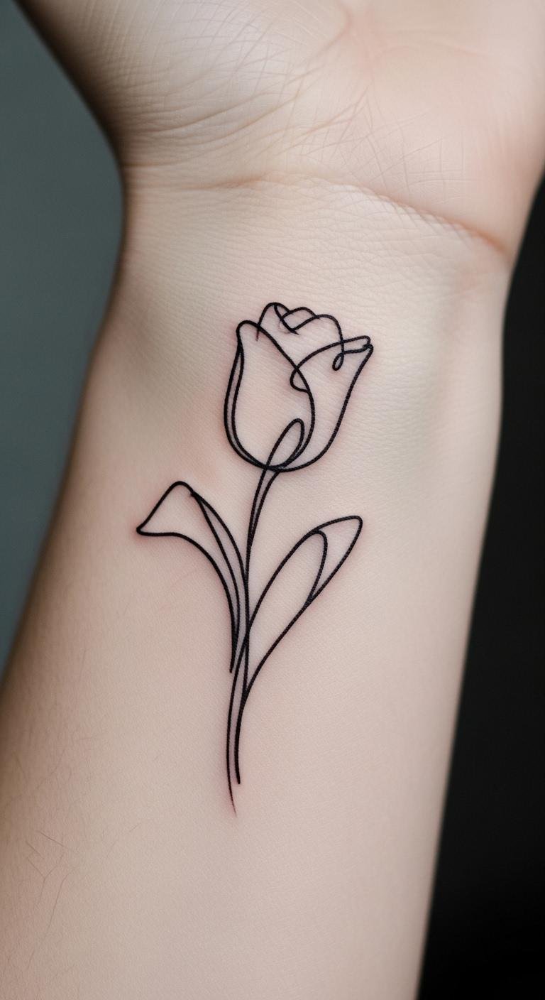 One-line tattoos are sleek. Draw a flowing tulip line. Get a marker and try it. Put it on your wrist. Find budget artists online. Prices begin at $60. Follow step-by-step guides. Keep the line steady. Care involves mild soap. This option is quick and easy. Experiment on paper first.