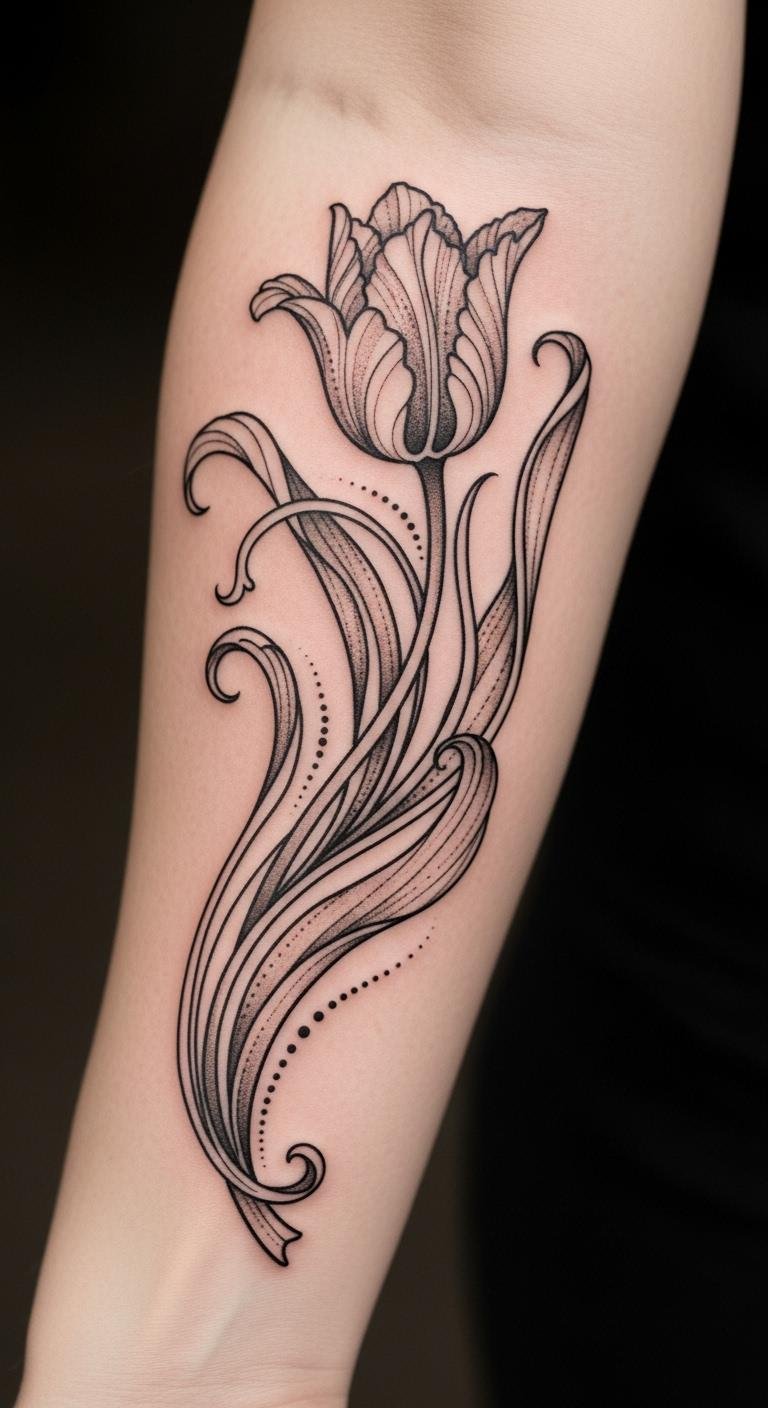 Curvy lines define this style. Draw swirling tulip elements. Use pencils for curves. Opt for shoulder placement. Find artists for $100. Watch design videos. Add flow to your sketch. Care with gentle creams. This adds elegance. Practice freehand.