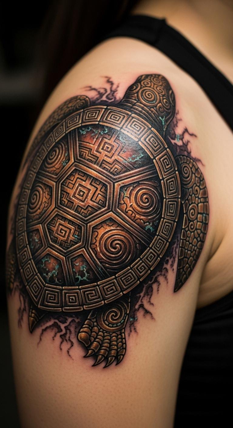 Bronze drum influences add heritage to turtles. They show history. Draw patterns from references. Use pencils for outlines. Put on your shoulder. Free resources online assist. Try temporary ink. Seek local deals. Customize elements. This design honors roots. Sketch ideas. It’s meaningful and easy.