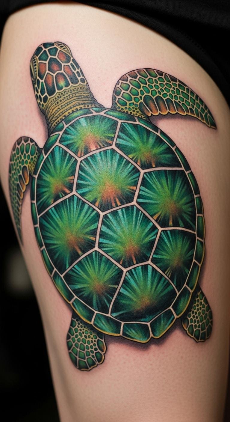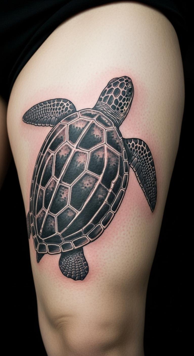 Leatherback turtles in realistic style highlight size and power. Research images first. Sketch the form. Place on your thigh. Apps help refine. Use temporaries. Artists have options. Add details. This design impresses. Draw it out. It’s straightforward.