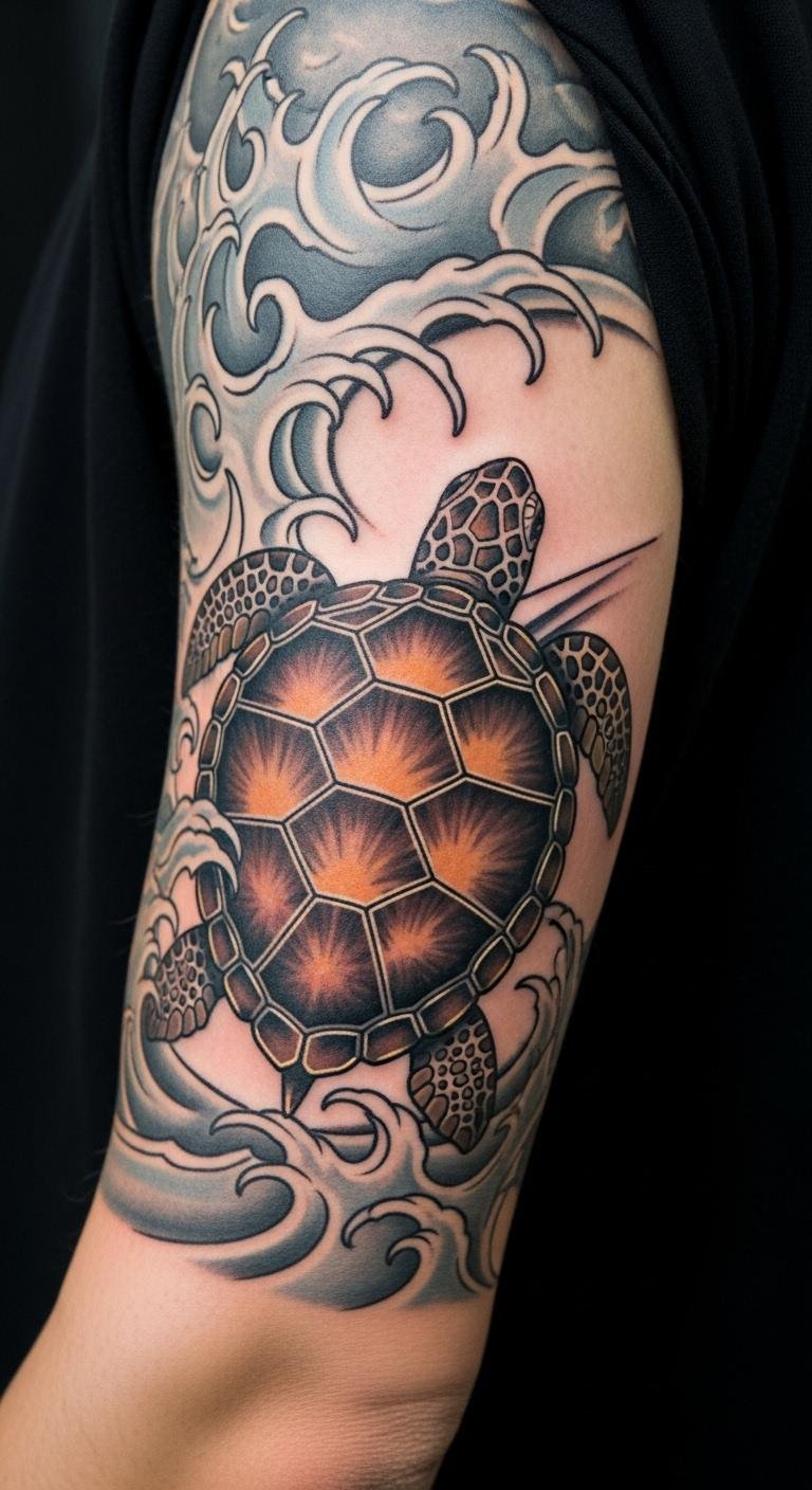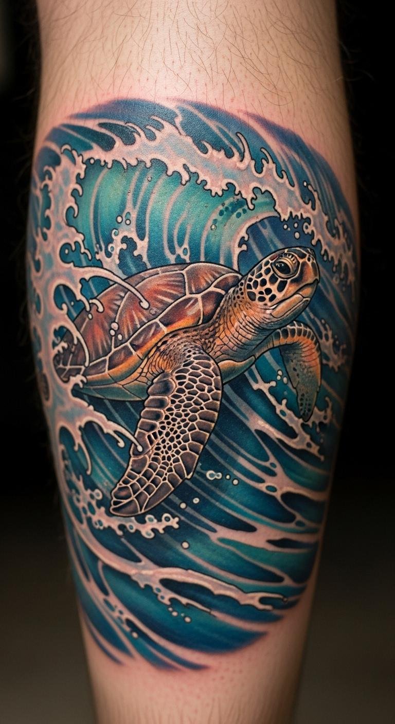 Waves with turtles represent flow and adventure. Sketch the scene on paper. Include water lines for effect. Place on your calf for movement. Online tools help design it. Test with stickers. Artists offer affordable combos. Add bubbles for fun. This design captures nature. Practice at home. It’s engaging and budget-friendly.