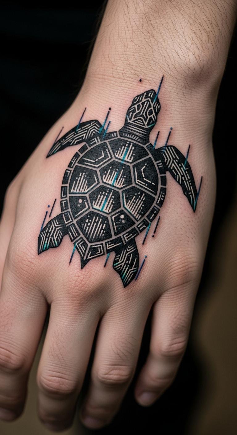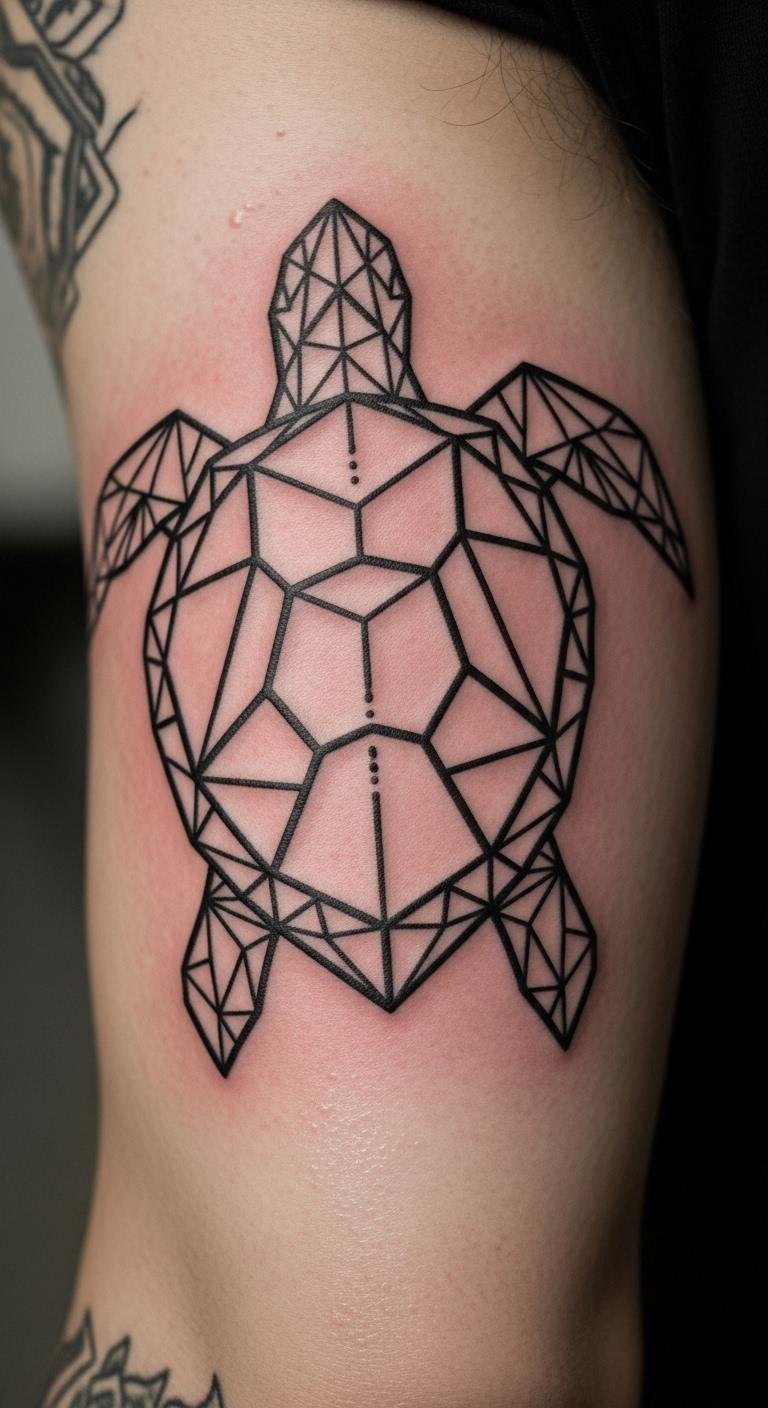 Geometric styles use shapes. Draw angular turtles. Include patterns. Place on arm. Free software helps. Test designs. Artists have options. Add edges. This design structures. Sketch ideas. It’s modern.