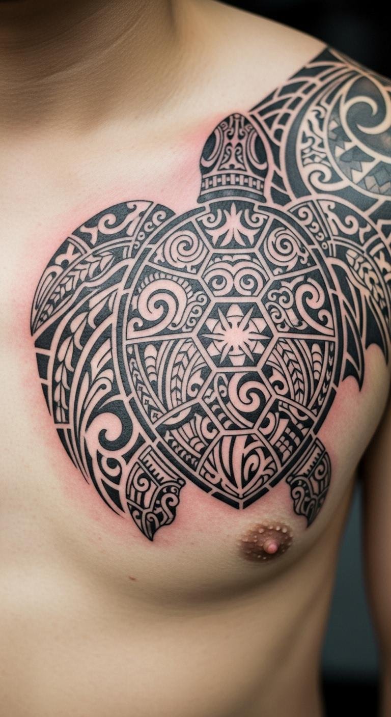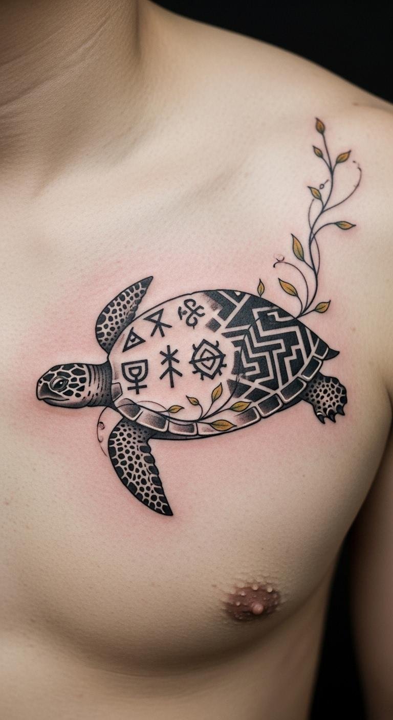 Turtle shell patterns focus on protection and strength. They make for a bold statement. Start by tracing patterns from books or sites. Use a marker to outline on paper. Put it on your chest for impact. Practice with henna or temporary ink. Customize by adding personal lines. Many shops offer these at reasonable rates. Keep it simple to cut costs. This design shields your story. Draw variations at home for ideas. It’s practical and empowering.