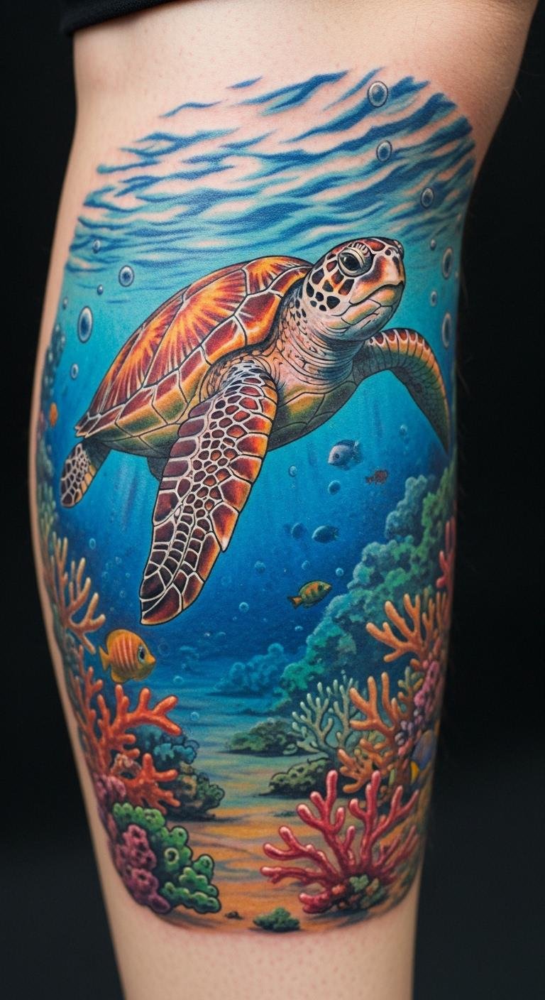 Coral with turtles evokes oceans. Draw reef scenes. Add corals. Place on leg. Free designs exist. Try temporaries. Artists offer combos. Customize underwater. This design immerses. Practice at home. It’s vivid.
