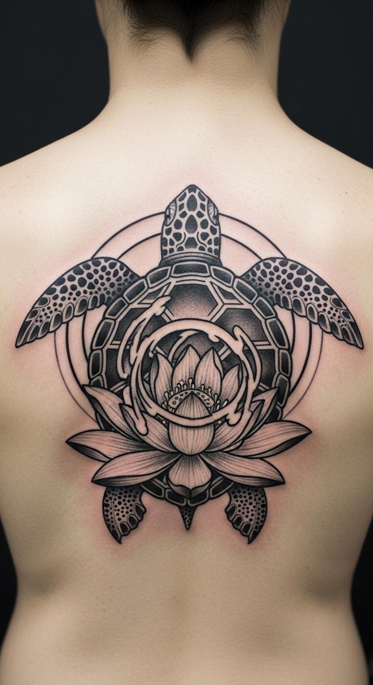 Combining a turtle with a lotus means harmony and growth. The lotus adds a floral touch to the design. Sketch both on paper to see how they fit. Use free drawing tools online for ideas. Place it on your back for a larger canvas. Temporary designs help you visualize the combo. Add the flower near the shell for balance. Look for affordable artists who do custom work. This setup tells a story of protection and beauty. Try drawing it with crayons at home. You’ll blend symbols affordably and creatively.