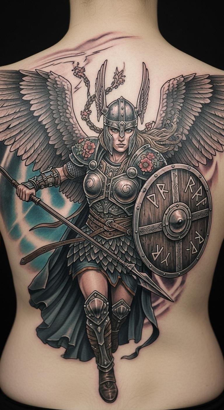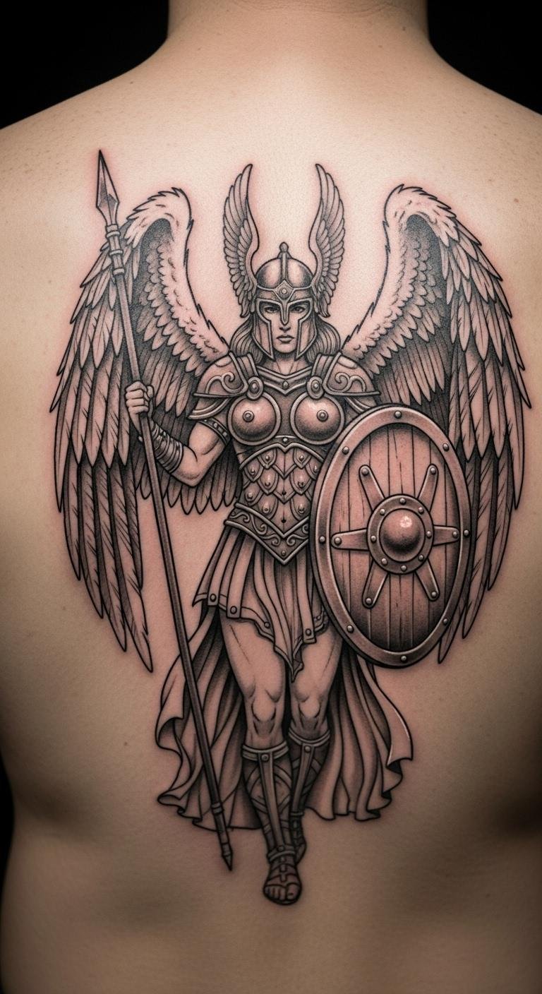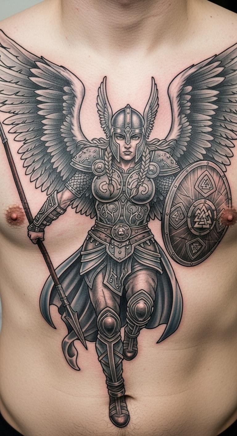 Think of the classic Valkyrie as your go-to for raw power. This design shows a winged female fighter in full gear. Start with a simple sketch on paper. Use free online tools to draw your version. Keep costs low by visiting local tattoo expos for deals. Pick a spot like your arm for easy viewing. Talk to artists about black ink only to save money. Add personal touches, like a small sword detail. This idea works for first-timers. Get feedback from friends before booking. Choose an affordable studio nearby. Expect quick sessions for smaller sizes. Focus on clean lines for longevity. Try shading practice with markers at home.