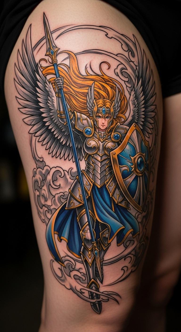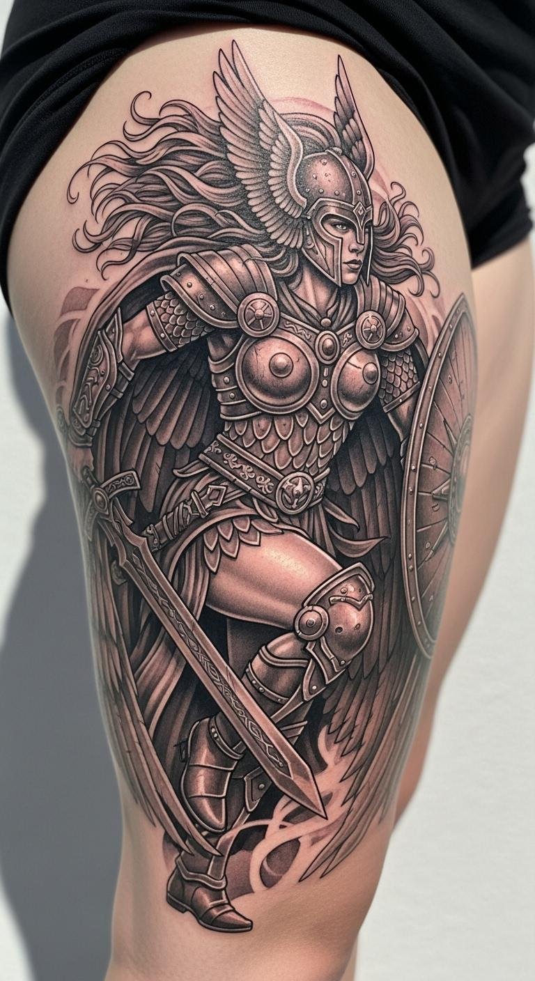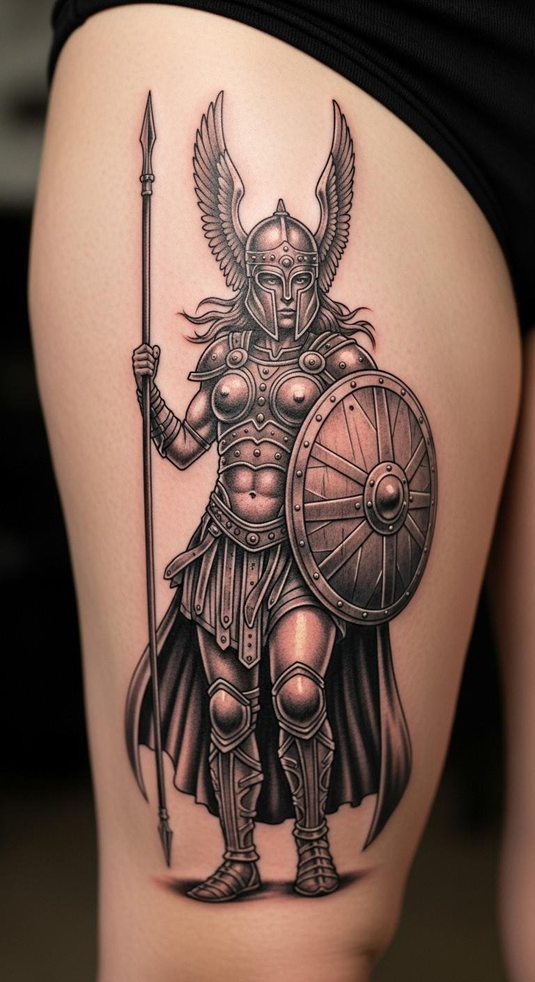 Celebrate strength with an empowerment Valkyrie. Focus on powerful poses. Draw inspiring figures at home. Find empowering themes at affordable shops. Put it on your thigh for boldness. Add motivational symbols. Use mirrors to pose ideas. This design empowers daily.