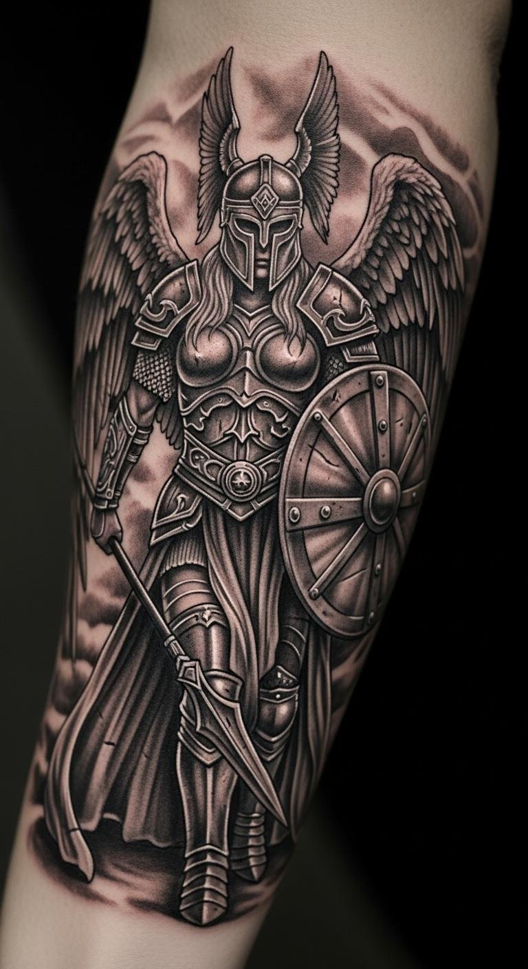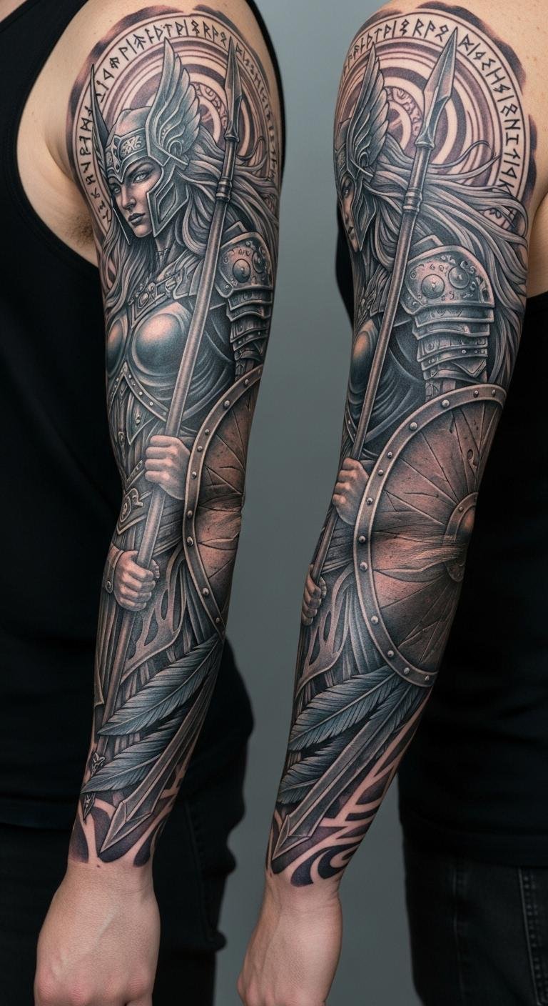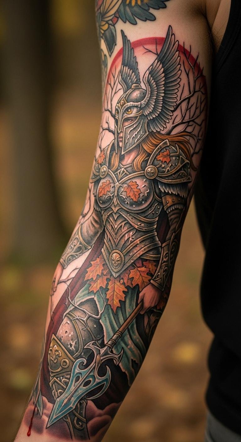 Turn your arm into a Valkyrie sleeve for full coverage. Start with arm sketches using markers. Look for artists offering sleeve packages. Add sections over time to save money. Place weapons along the length for flow. Use phone filters to visualize. This design suits sleeves well. Protect with long sleeves from your wardrobe. Build it gradually for affordability.