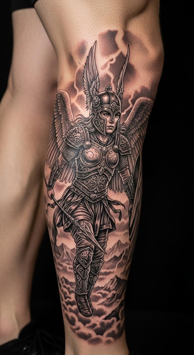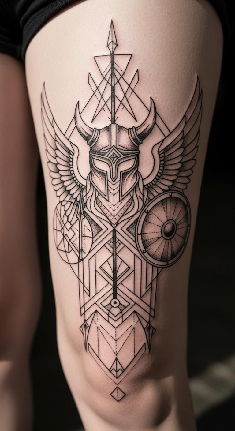 Fuse geometry with Valkyrie for a modern twist. Think shapes around a fighter. Draw grids on paper to plan. Search for deals on geometric work. Place on your leg for stability. Add triangles for strength. Use rulers at home for accuracy. This design fits math lovers. Keep it simple for cost.