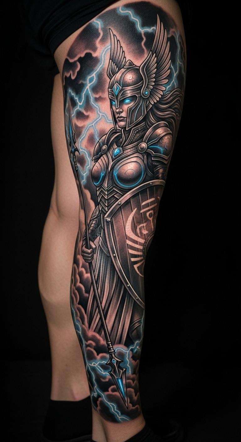 Thigh tattoos let you go big with Valkyrie themes. Picture a full warrior scene that wraps around your leg. Draw ideas on your body with washable pens first. Look for budget artists online who offer thigh specials. This spot hides easily under clothes. Add elements like runes for extra meaning. Use phone apps to preview designs on your skin. Go for sessions in off-peak times to cut costs. Pair it with simple aftercare like unscented lotion from your shelf. This placement suits active folks. Experiment with sizes using tracing paper. Book when studios have promotions.