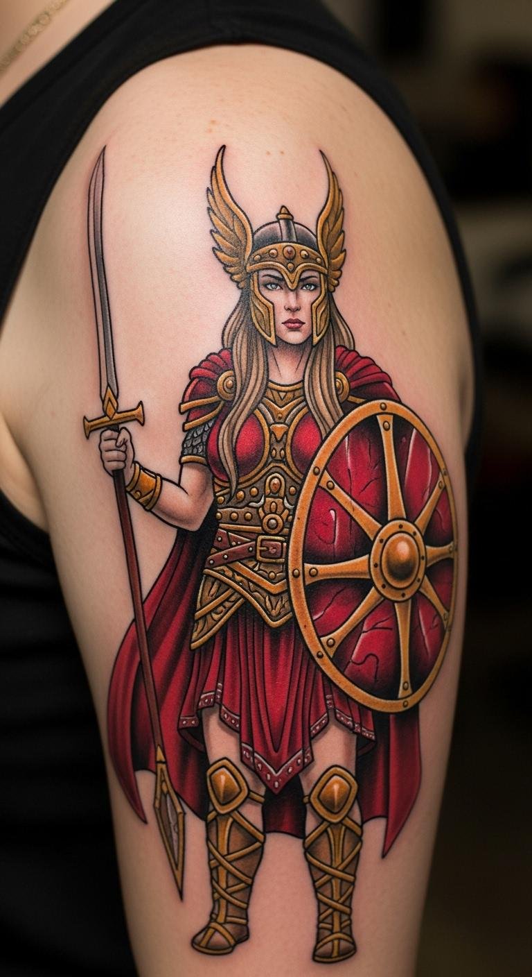 Bring vibrancy with red and gold shades in your Valkyrie tattoo. Imagine a warrior glowing with these hues. Mix colors using free digital apps before deciding. Look for artists who use cost-effective pigments. Place it on your shoulder for balance. Add gold accents with metallic markers for home trials. Schedule during sales for savings. This combo pops on fair skin. Use old shirts to protect the area post-tattoo. Keep designs symmetric for easier inking.