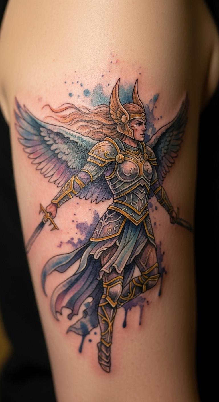Try a watercolor Valkyrie for a painted feel. This uses soft, blended colors. Experiment with watercolors at home first. Find budget options for colorful ink. Put it on your rib for a hidden touch. Add faint edges for whimsy. Use apps to blend colors digitally. Schedule for quick sessions. This style pops with minimal lines.