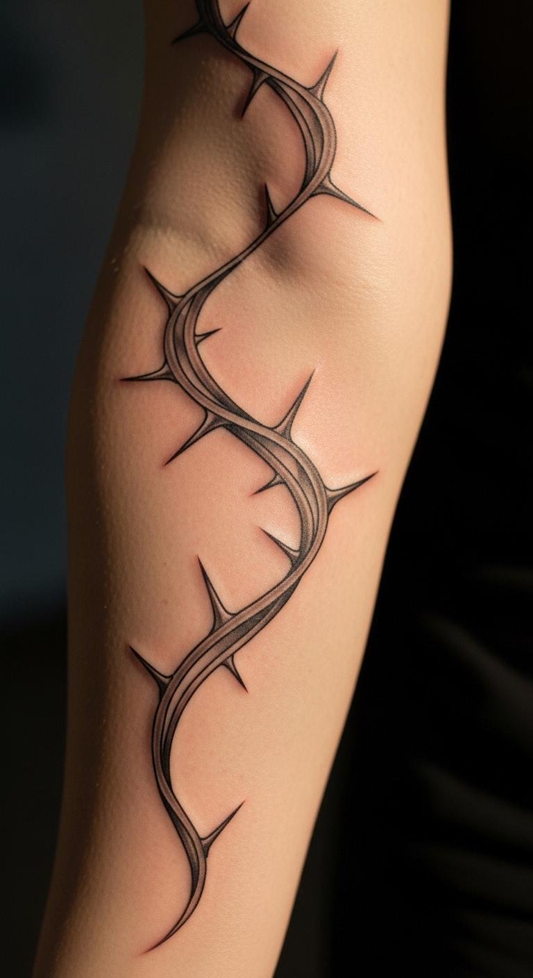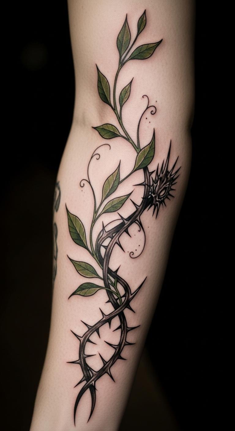 Picture this: a simple vines and thorns tattoo that shows life’s ups and downs. Start with basic black ink outlines on your arm. This design uses twisting vines to mean growth and thorns for protection. Keep costs low by sketching ideas at home with a pen and paper. Try a DIY mockup on your skin with washable markers to test the look. Pair it with everyday jewelry for a subtle boost. Bold the key: thorns add edge. Go to a local artist who offers budget sessions. Aim for clean lines that wrap naturally. This idea fits anyone wanting a quick, meaningful piece. Add personal touches like a small flower bud. You’ll walk away with art that tells your story without breaking the bank. Focus on placement for daily visibility. Enjoy the process as a fun weekend project.