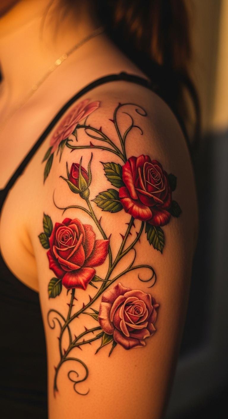 Go bold with neo-traditional vines. See thick lines and colors twisting on your side. Plan on a budget using free drawing tools online. Print and trace the pattern with markers at home. Choose bright greens for a pop. Place it on your shoulder for bold impact. Match with tees from your wardrobe. Book a spot at a local studio with package rates. Focus on clear outlines that stand out. Throw in a thorn for contrast. This style makes your tattoo pop without extras. Practice symmetry with mirrors. Wear it proudly as part of your routine.