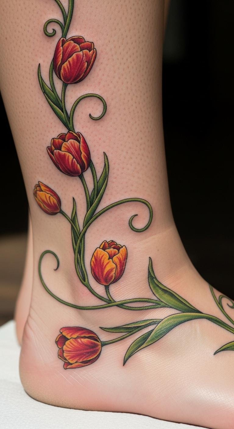 Tulips on vines offer forgiveness. Imagine them on your ankle for grace. Plan with colored papers. Trace with safe inks first. Use bright tulip hues. This area adds a dainty touch. Combine with socks you have. Go to artists with flower specials. Let vines hold the tulips. Include stems for detail. It speaks softly. Test with fabric prints. Make it personal.