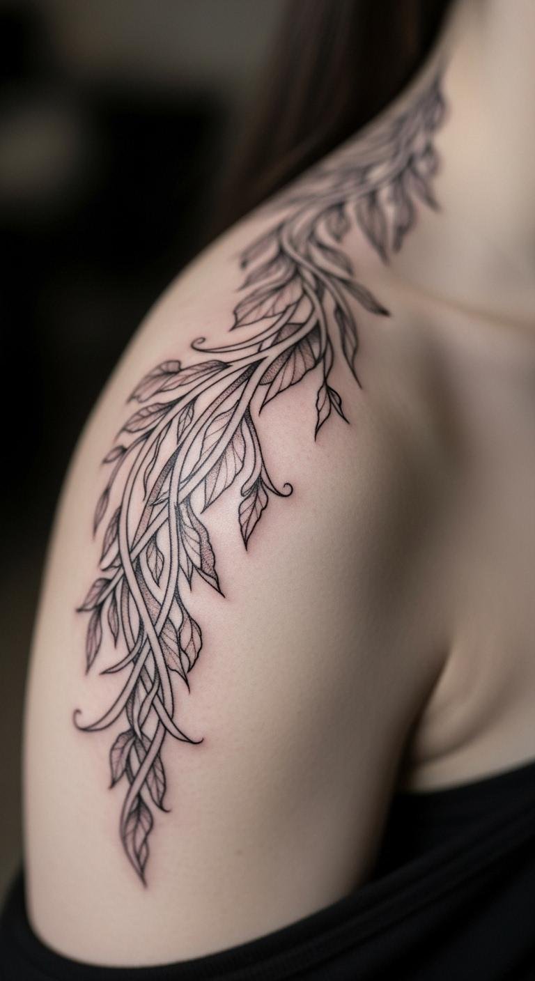 Fine lines on vines intrigue. Place them on your shoulder for art. Draw detailed patterns at home. Use fine-tipped pens for practice. Stick to precise blacks. This spot shows off skill. Pair with shirts you wear. Book with line experts affordably. Focus on even lines. Add crossings for complexity. It showcases talent simply. Try with thread strings. Enjoy the detail.