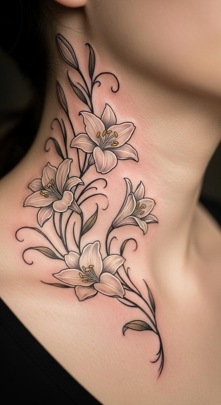 Lilies on vines speak of fresh starts. See them on your neck for purity. Sketch with markers on paper first. Trace with safe body paint for a trial. Choose white accents for clean lines. This area adds a touch of grace. Match with necklaces you have. Go to an affordable local expert. Make vines support the lilies. Include a bud for growth. It symbolizes renewal in a simple way. Test with flower stickers. Wear it as a daily affirmation.
