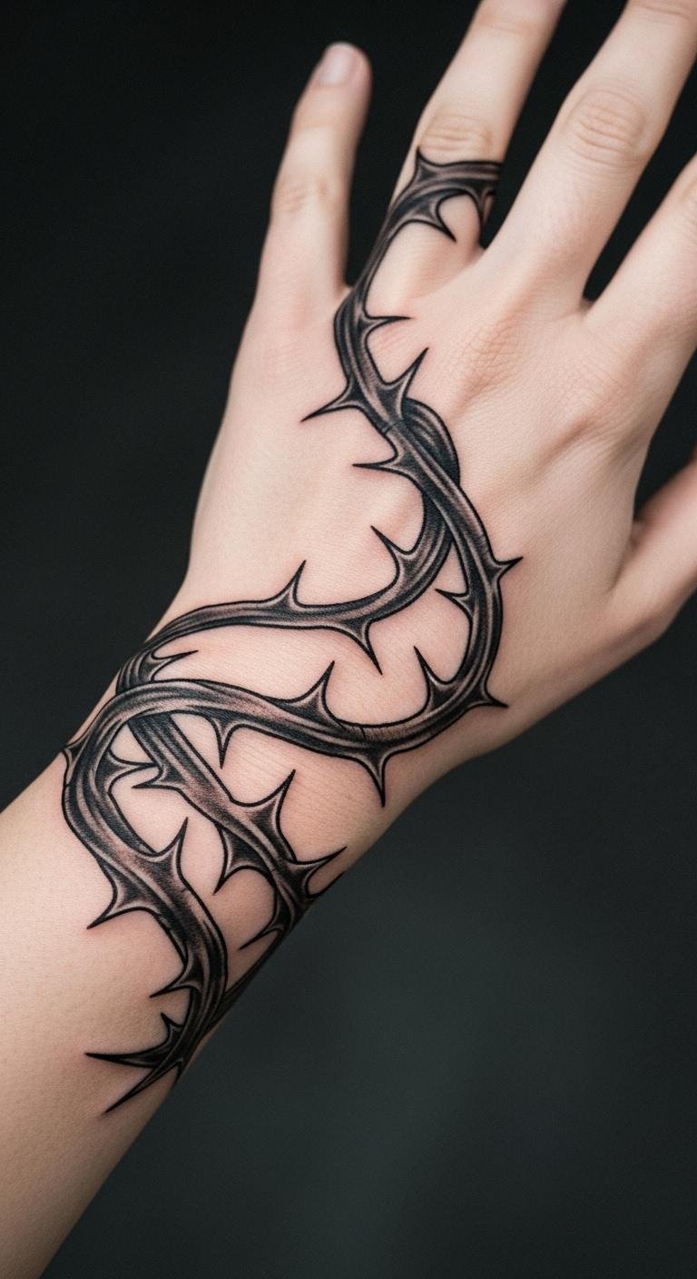 Thorns on vines mean safety. Imagine them on your hand for guard. Plan with drawings at your table. Use pins to outline on skin temporarily. Stick to sharp black lines. Position on your finger for visibility. Pair with rings from home. Book a session with cost-effective options. Let thorns stand out clearly. Add a vine loop for flow. This design protects your story. Practice with wire shapes. It fits into your routine easily.