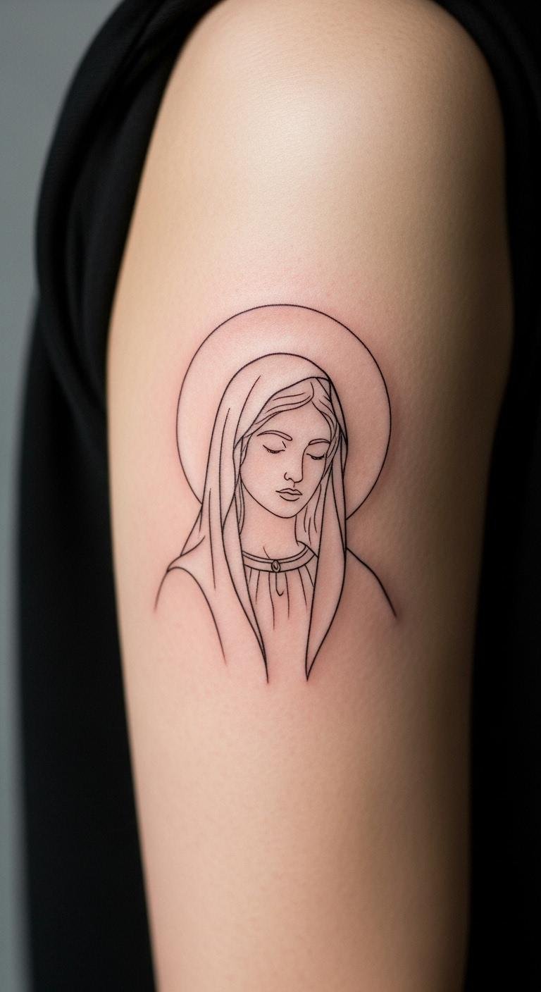 Fine line tattoos keep things elegant and understated. Think of a slim outline of the Virgin Mary on your wrist. This style uses precise lines for a clean look. Start with a sketch on paper to visualize it. For budget tips, use free online tattoo design apps to experiment before visiting an artist. Keep costs low by choosing a small size, around 2-3 inches. Break it down: pick a local shop with experience in religious art. They often offer consultations for under $50. Add a personal touch, like a small flower beside her. This makes it uniquely yours. Go for black ink to avoid extra fees. Healing is simple—clean the area twice a day with gentle soap. You’ll see the design clearly in a week. Try covering it with breathable bandages at first. Remember, this tattoo serves as a daily reminder of faith. Opt for a spot that’s easy to hide if needed. Get one that inspires quiet reflection.