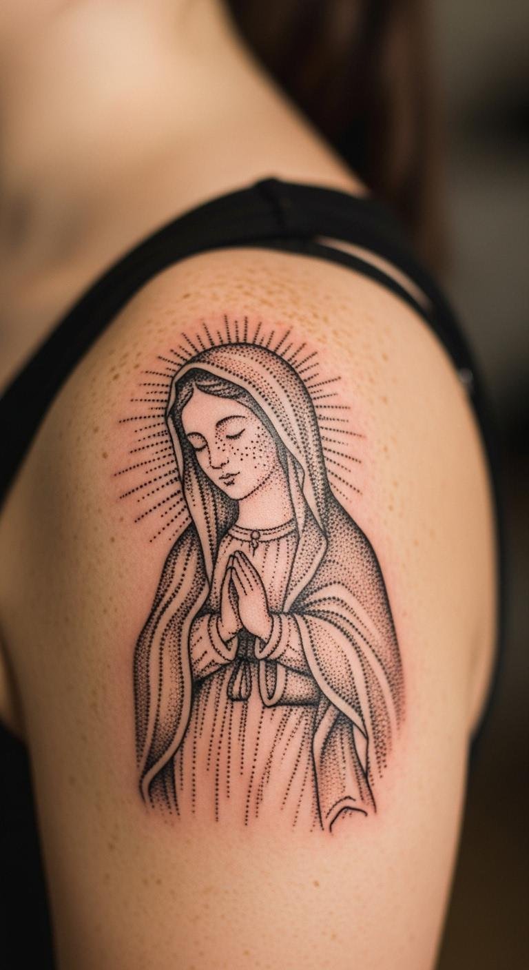Shoulder blade placement hides or shows. Mary there feels protective. Sketch for fit. Affordable spot. Placement for comfort. Easy healing. Personal faith choice.