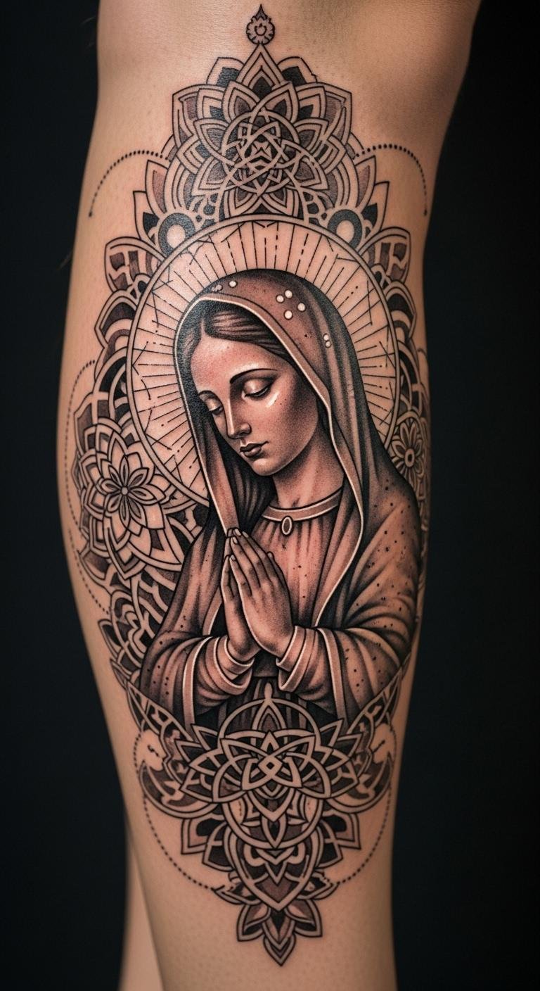 Geometric patterns frame Mary. Try on your calf for balance. Use rulers for ideas. Affordable designs. Patterns add structure. Heal carefully. Modernizes faith.