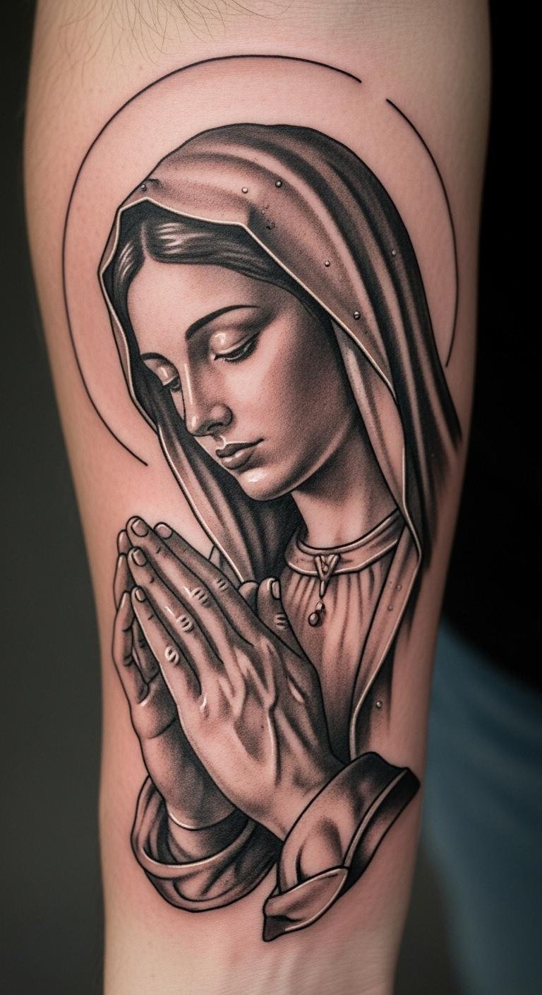 Shading in black and gray adds dimension. See Mary on your shoulder with soft tones. It looks timeless. Practice with grayscale drawings. Keep costs at $90 for small designs. Shading enhances emotion. Use basic lotions for aftercare. This technique makes faith feel real.