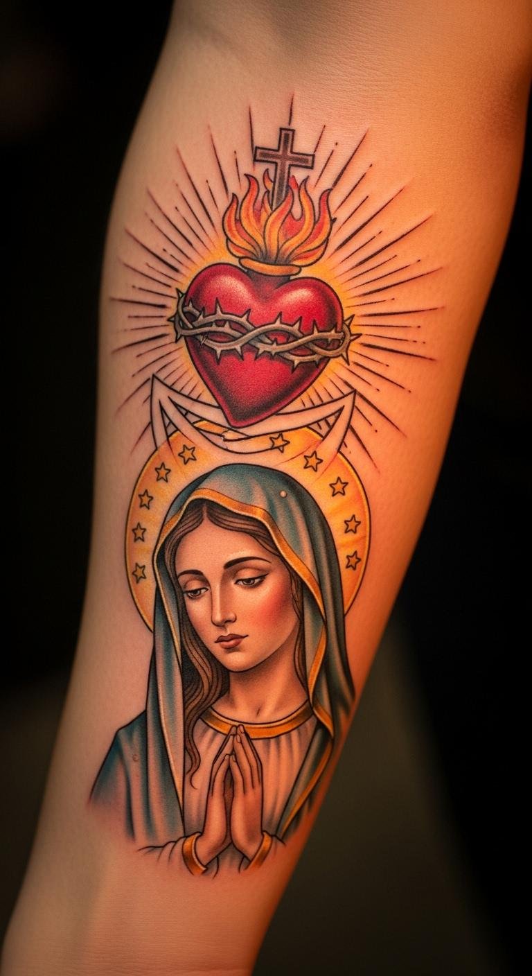 Fusing Sacred Heart with Mary creates a powerful combo. Envision her image holding the heart on your arm. This merges two symbols seamlessly. Start by mixing sketches from books or apps. Keep costs down with a medium size, around $150 total. Use household items like paper and markers for planning. Bold the point: heart adds protection. Heal by keeping it dry for days. Place it on your chest for a personal touch. This design tells a story of faith. Visit a shop with religious expertise. Simple actions: apply sunscreen later to maintain colors. It’s an affordable way to deepen your spiritual expression.