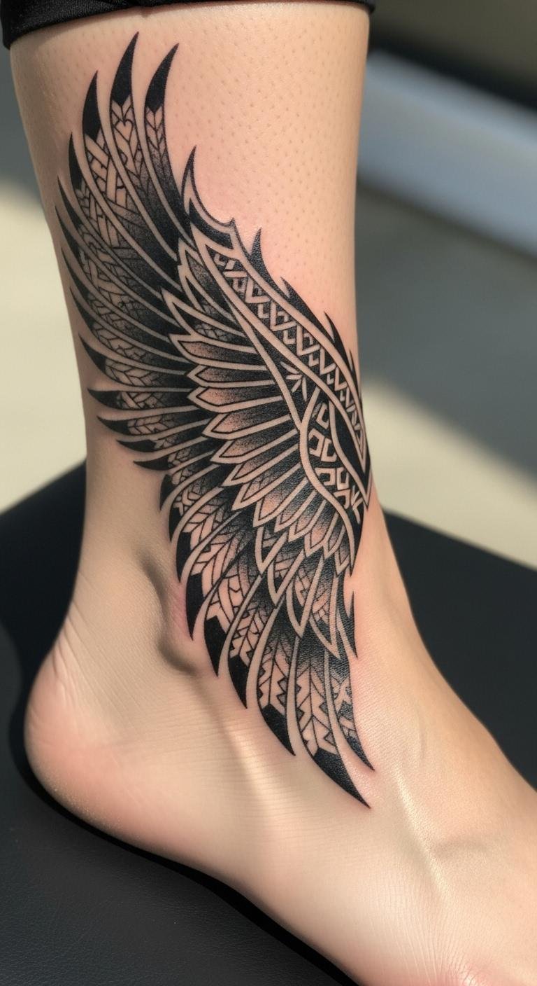 Bold patterns add cultural flair to your ink. Tribal wing tattoos use sharp lines and shapes for strength vibes. Put it on your ankle for a discreet spot. Prices start at $150. Draw simple patterns with a pen at home to experiment. Check free tribal art resources online. Bandage it properly after getting it. This style honors heritage in a fun way. Choose smaller sizes to cut expenses. It’s great for arm or leg areas.