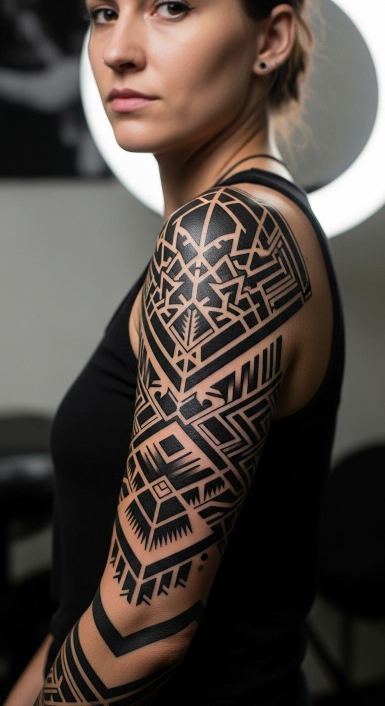 Shapes like triangles add a modern edge to your sleeve. Choose a few patterns that catch your eye. Draw them on paper first as a free DIY step. Use henna kits, costing less than $10, to test on your skin. Visit a nearby shop for the real thing, starting at $100. Stack simple lines for a custom build. Real tip: Trace a geometric design from online images and tweak it yourself. This method ages well and stays clear. Go for symmetry to make it personal.