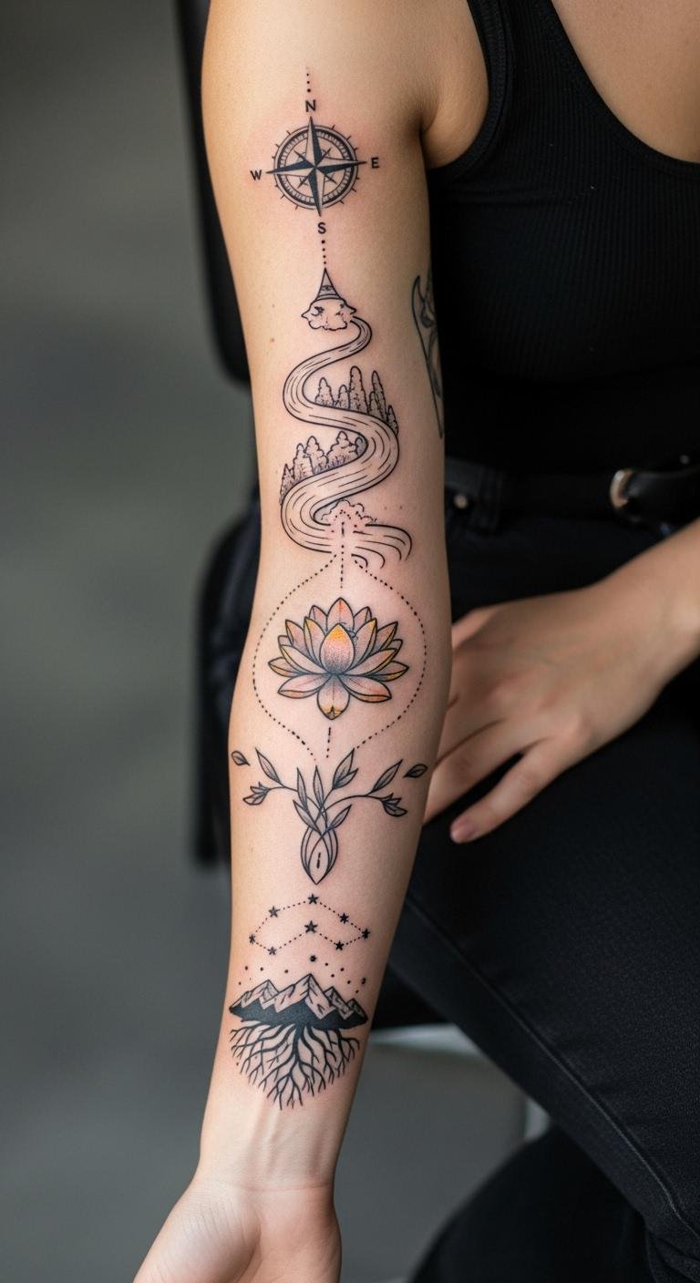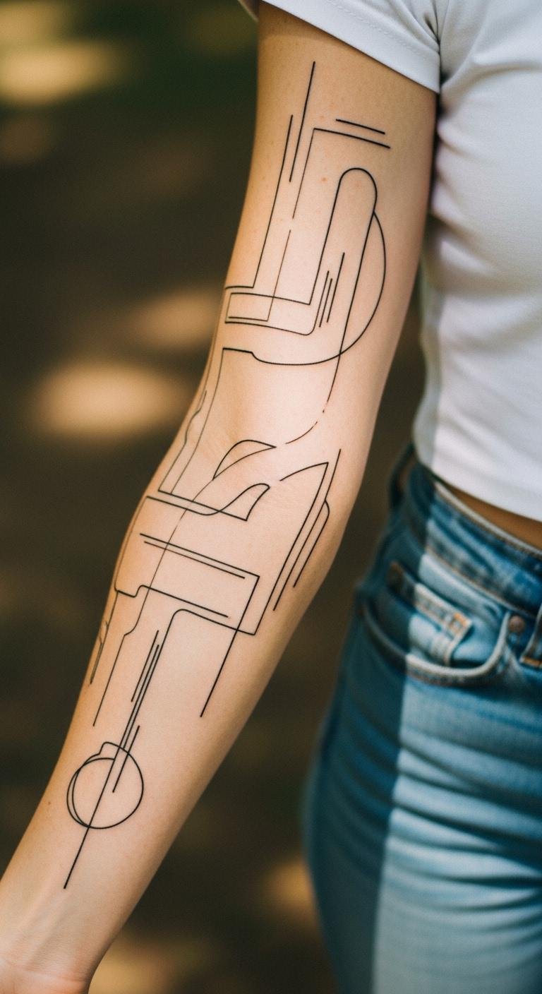 Clean lines keep things straightforward on your arm. Choose a few strokes that speak to you. Draw them with a pen as a no-cost tryout. Stick-on versions are cheap at $3. Head to a studio for $80 or less. Add one line at a time. Real tip: Use string to outline on your arm before committing. This style lasts and fits any budget. Make it your own with small changes.
