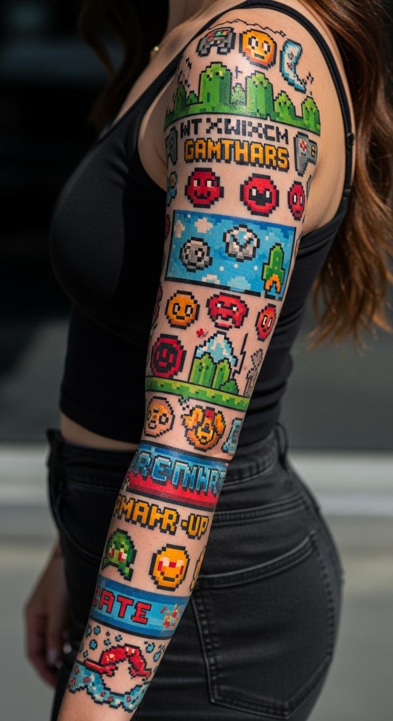 Pixel art brings games to your skin. Pick icons from old favorites. Grid them out on graph paper at no charge. Sticker sets cost $5 online. Real tattoos begin at $120. Add pieces one by one. Real idea: Design your own pixels using phone apps. This look stays playful and affordable. Adjust for your arm’s flow.
