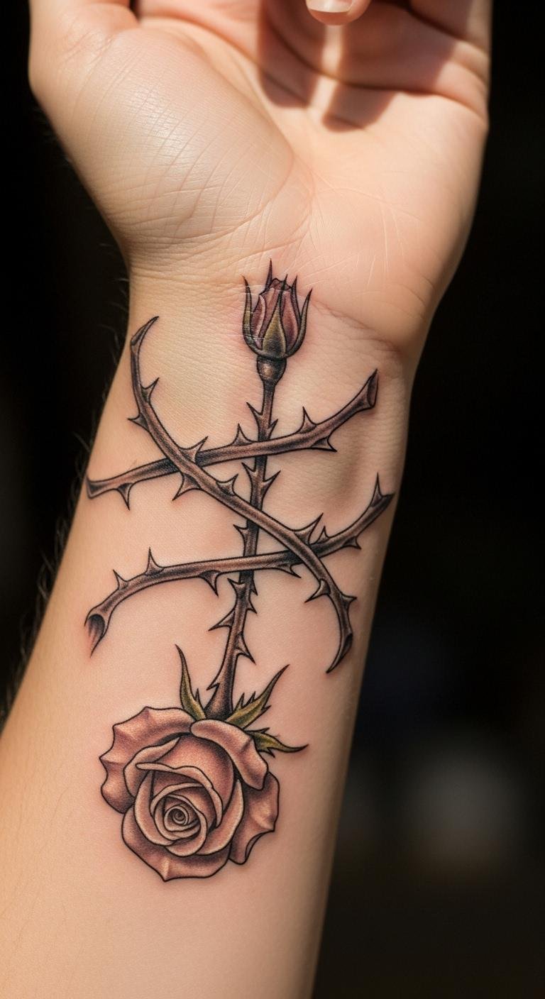 Rose thorn tattoos add edge.